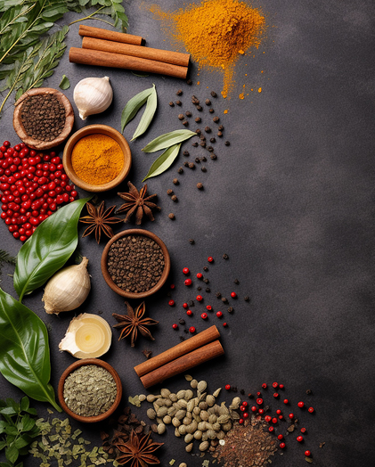 - The diverse range of spices includes turmeric, cumin, coriander, cardamom, black pepper, and chili, among others.